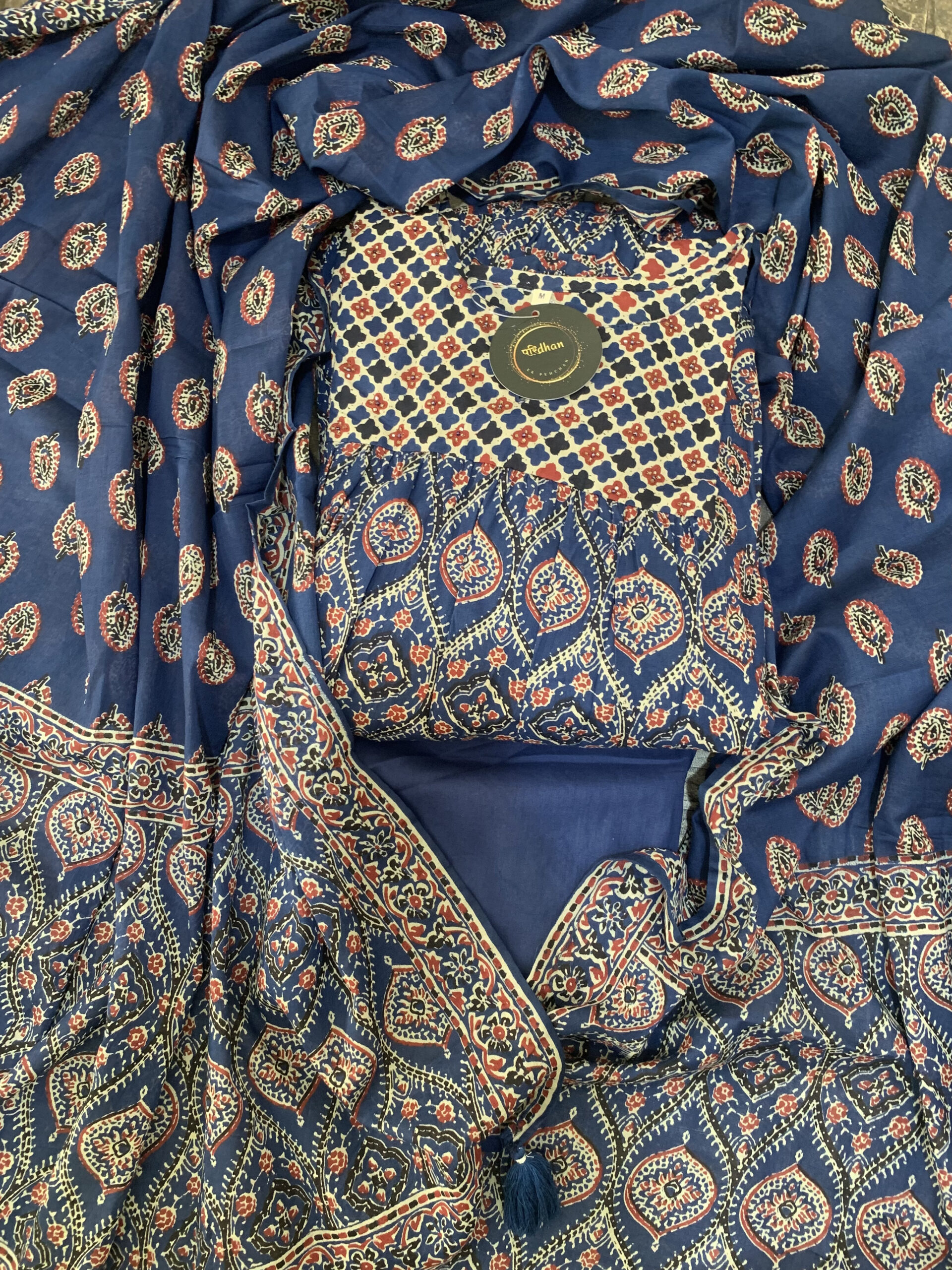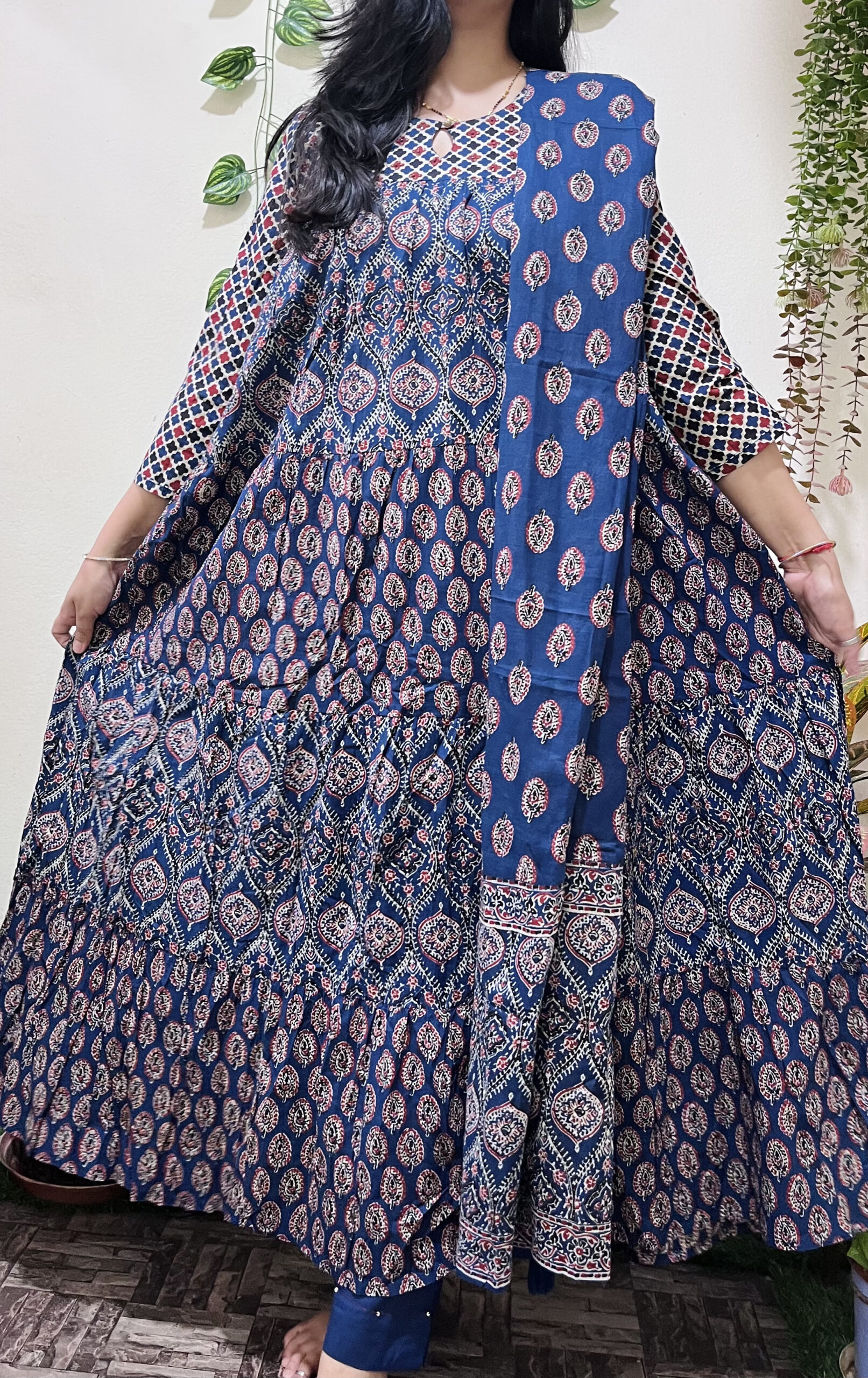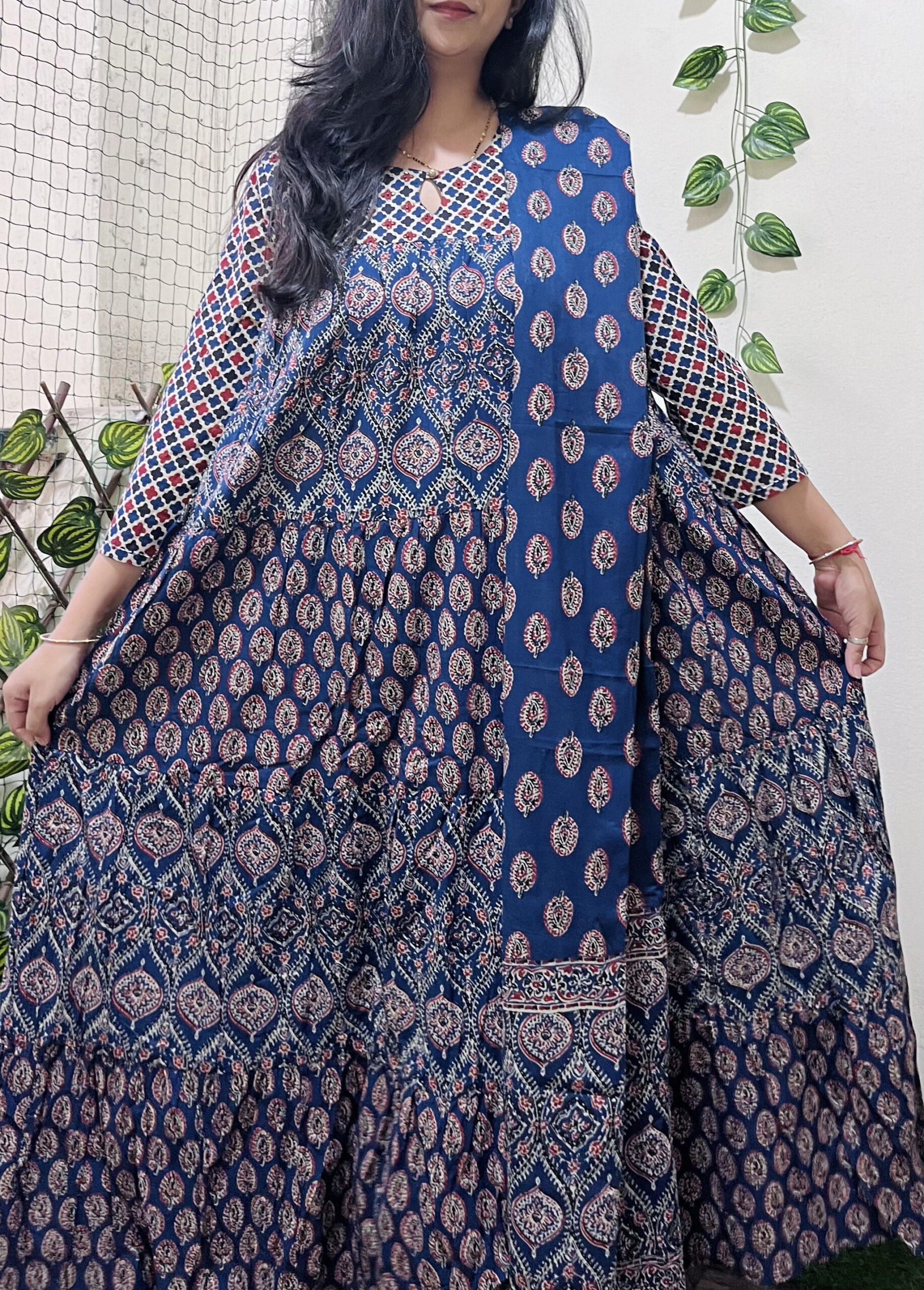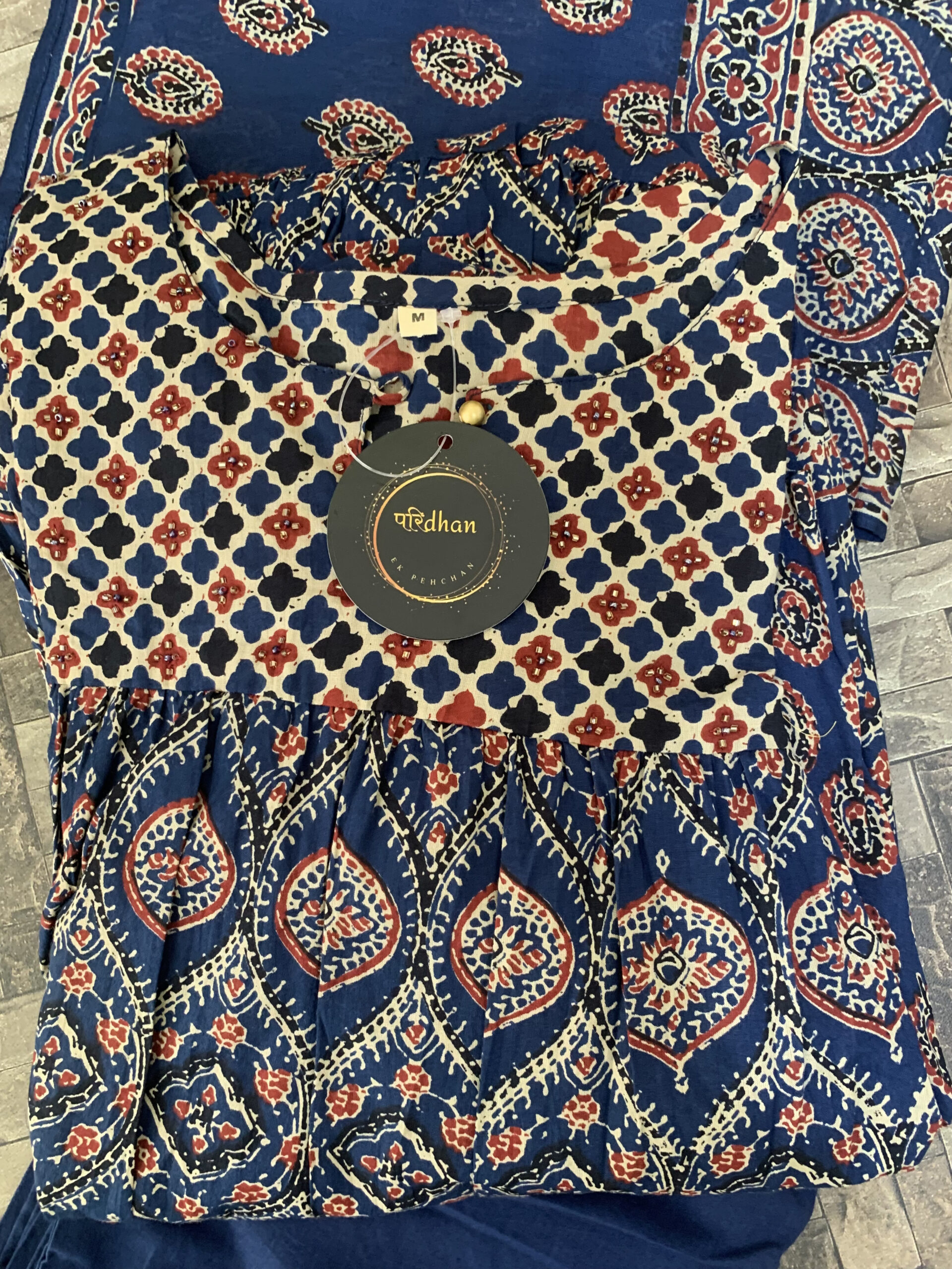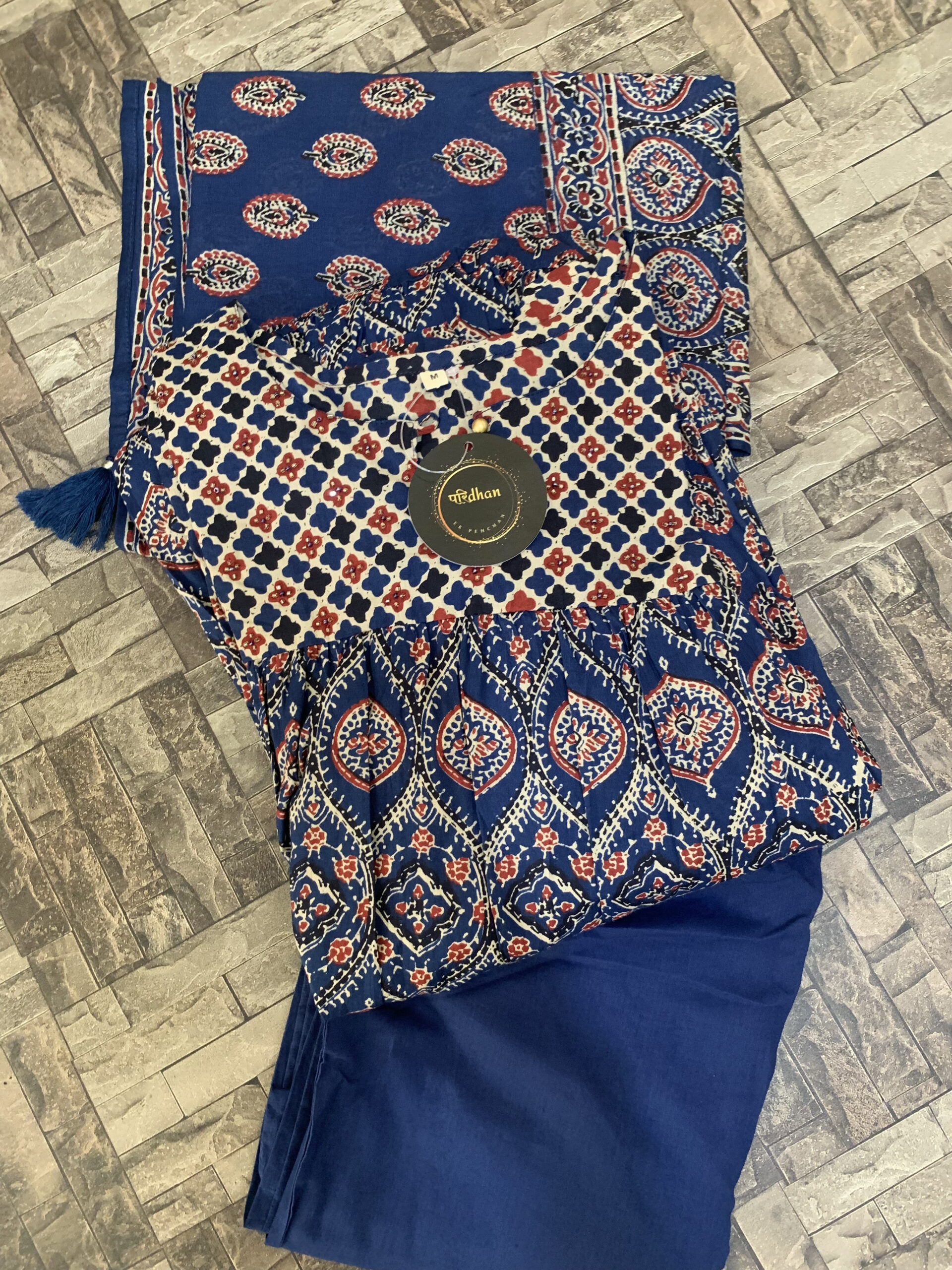 Elevate your ethnic wardrobe with this stunning Ajrakh print kurta set, crafted in rich indigo hues and adorned with intricate block-printed motifs. The kurta features a mix of symmetrical patterns and patch-style panels that reflect the timeless beauty of traditional Ajrakh art. Designed in a flared silhouette with 3/4th printed sleeves and a keyhole neckline, it’s as comfortable as it is eye-catching. Perfect for festive wear, cultural events, or everyday elegance with a heritage twist.
