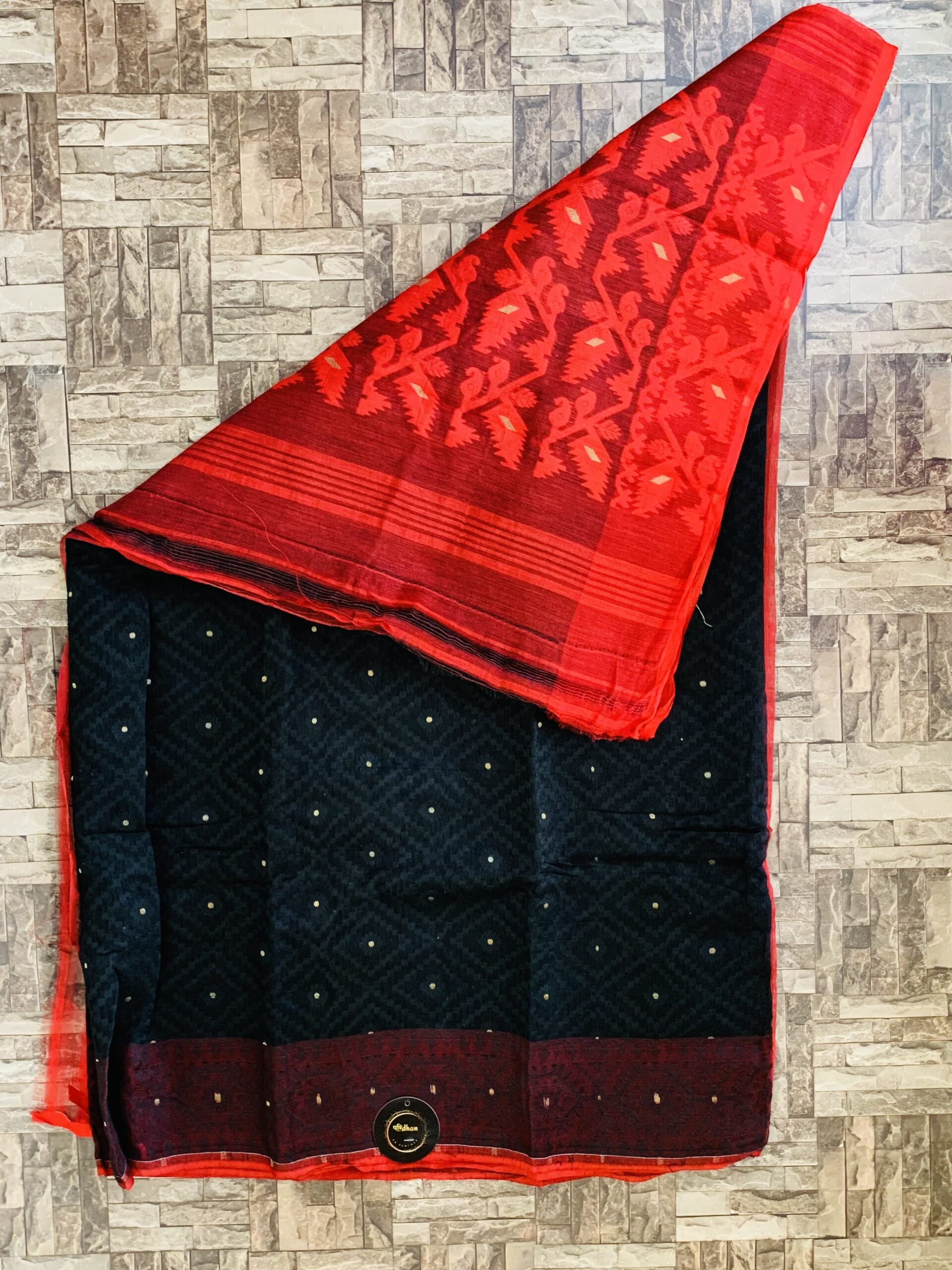 This beautifully crafted black and red cotton saree is a testament to timeless Indian handloom artistry. The body of the saree features an elegant diamond-checkered pattern adorned with delicate butti motifs, giving it a subtle yet refined appeal. The vibrant red pallu is intricately woven with traditional Ikat designs, adding a burst of color and ethnic charm. The maroon border further enhances the overall look with fine detailing, creating a perfect balance of sophistication and tradition. Ideal for both daily wear and festive occasions, this saree promises unmatched comfort with its breathable cotton fabric.