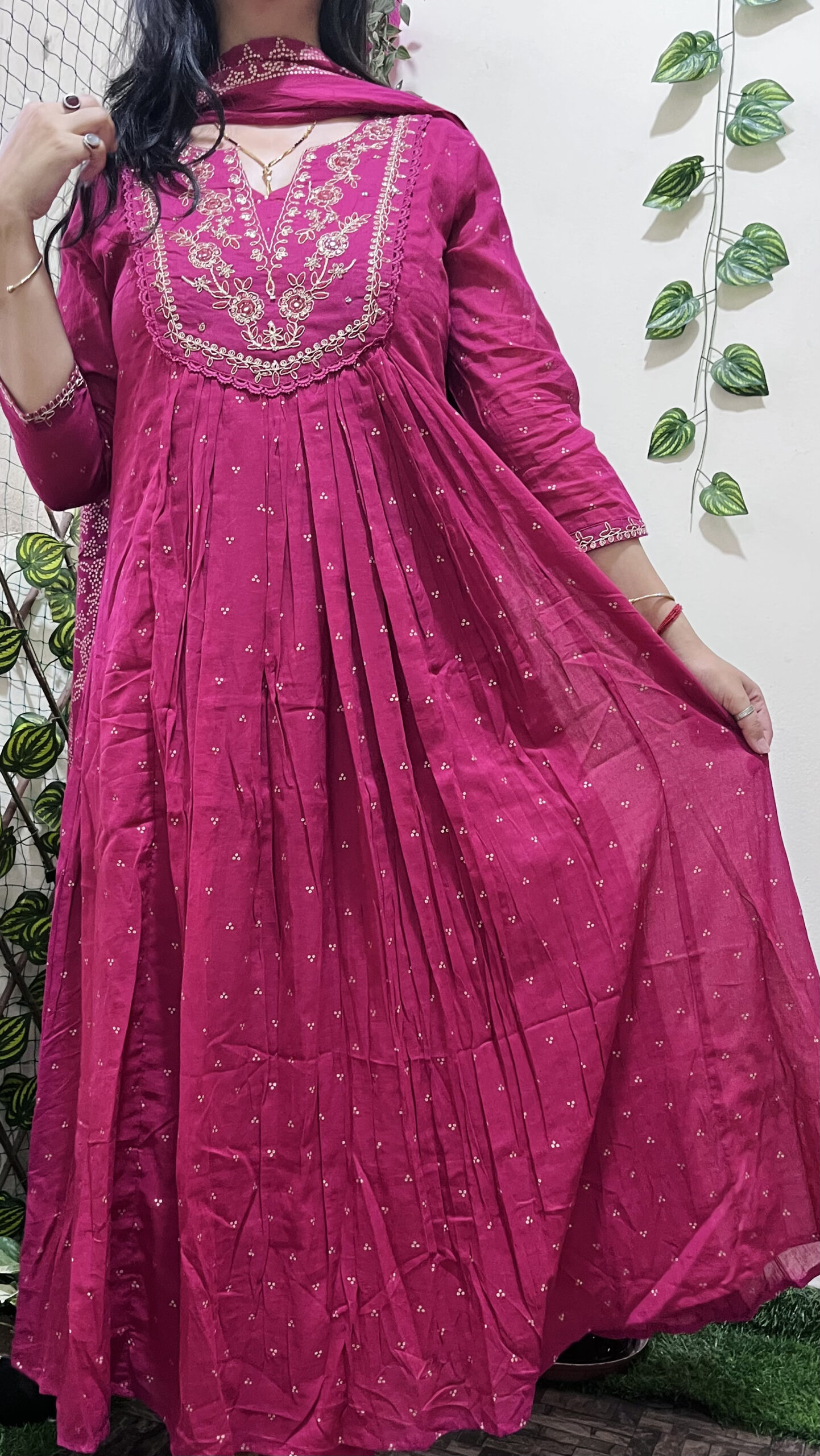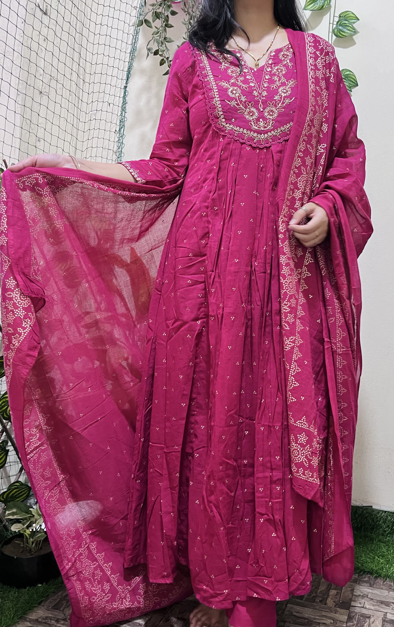Step into elegance with this striking fuchsia pink kurta set, featuring delicate embroidery enhanced with mirror work along the yoke and sleeves. The flared silhouette with front pleats brings a graceful flow to your movement, while the matching dupatta with geometric motifs adds a classic ethnic touch. Crafted in breathable cotton, this set is a go-to for festive get-togethers or traditional daywear.