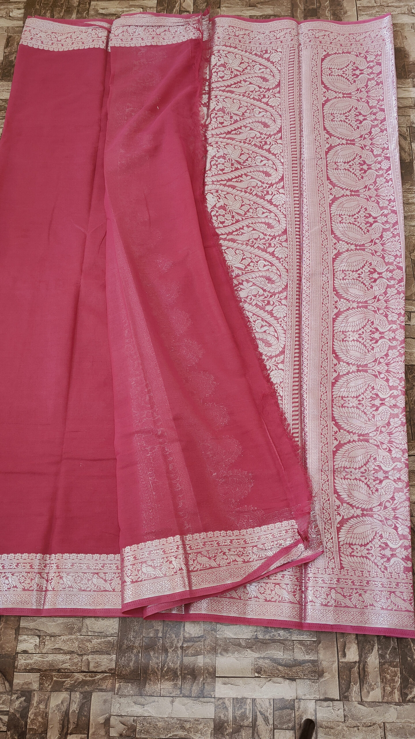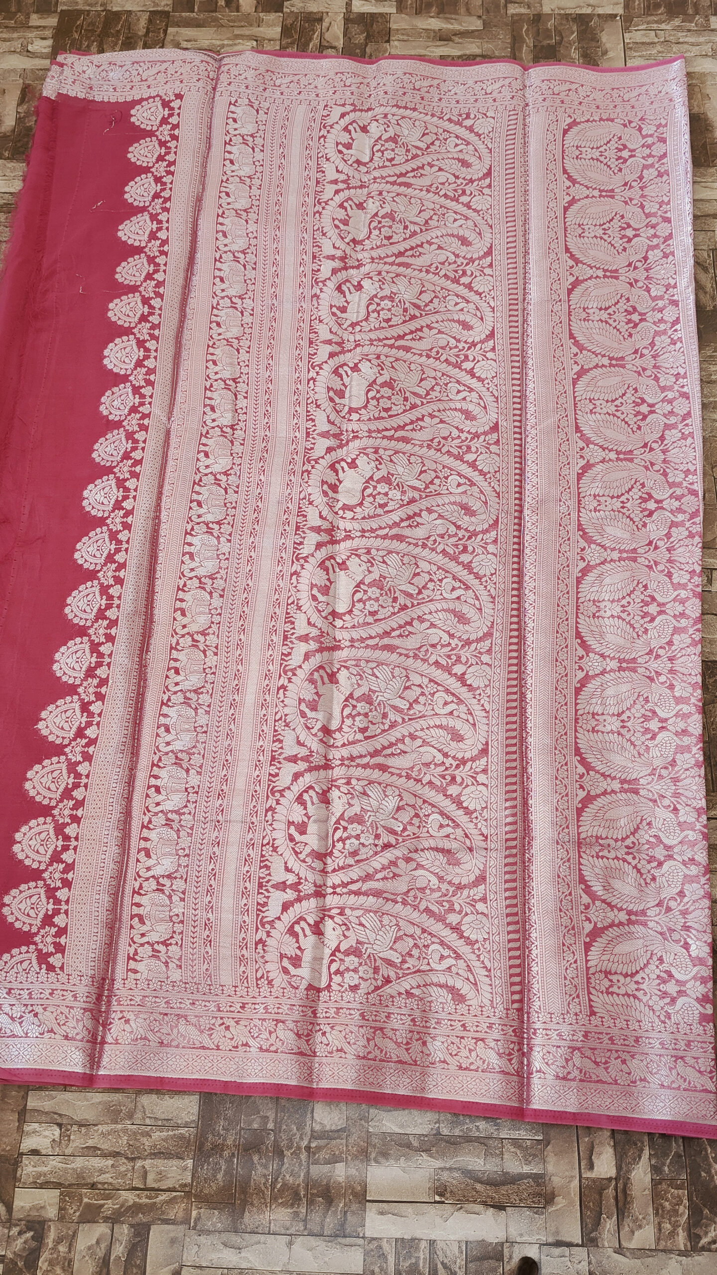 Embrace timeless elegance with our Gulbano rose pink Banarasi silk saree, crafted with intricate silver zari weaving along the pallu and borders. The rich floral and paisley motifs reflect classic Banarasi craftsmanship, making it a graceful choice for festive occasions and wedding functions. Its soft yet lustrous texture adds a royal touch to your ethnic wardrobe.