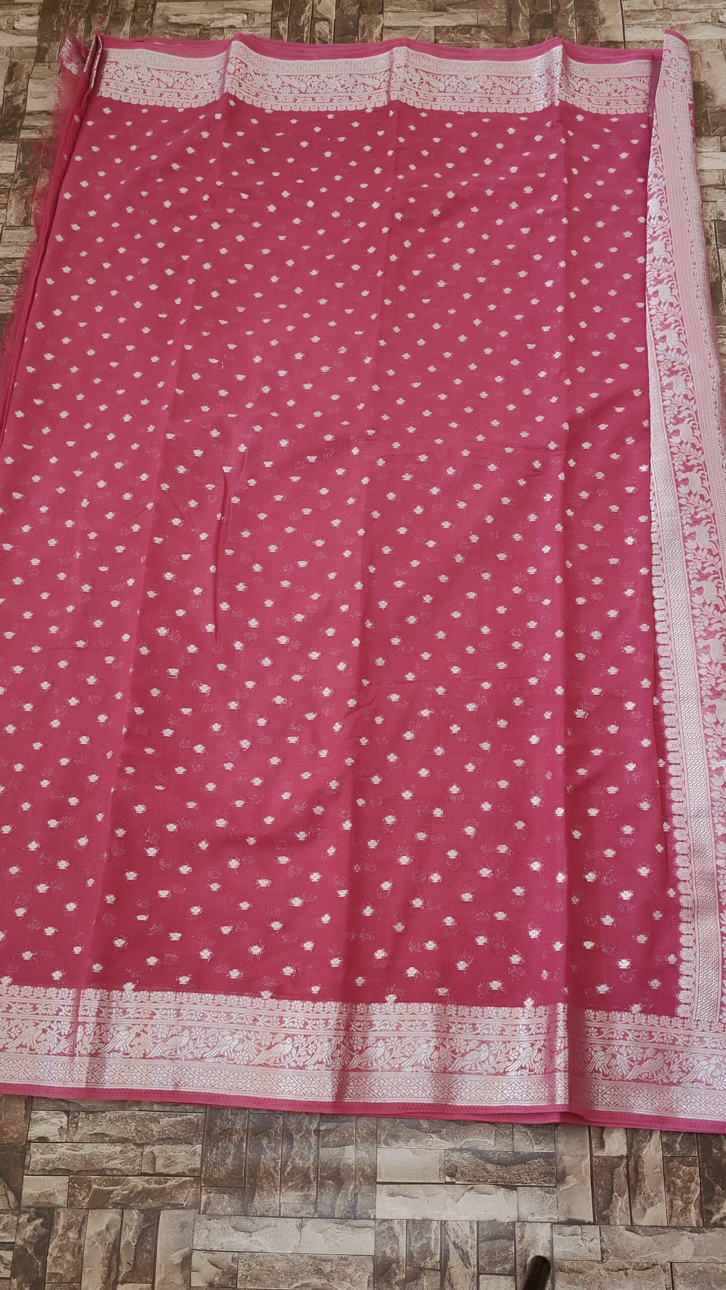 Graceful rose pink Banarasi silk saree with exquisite silver zari floral motifs – a perfect pick for weddings, parties, and traditional celebrations.