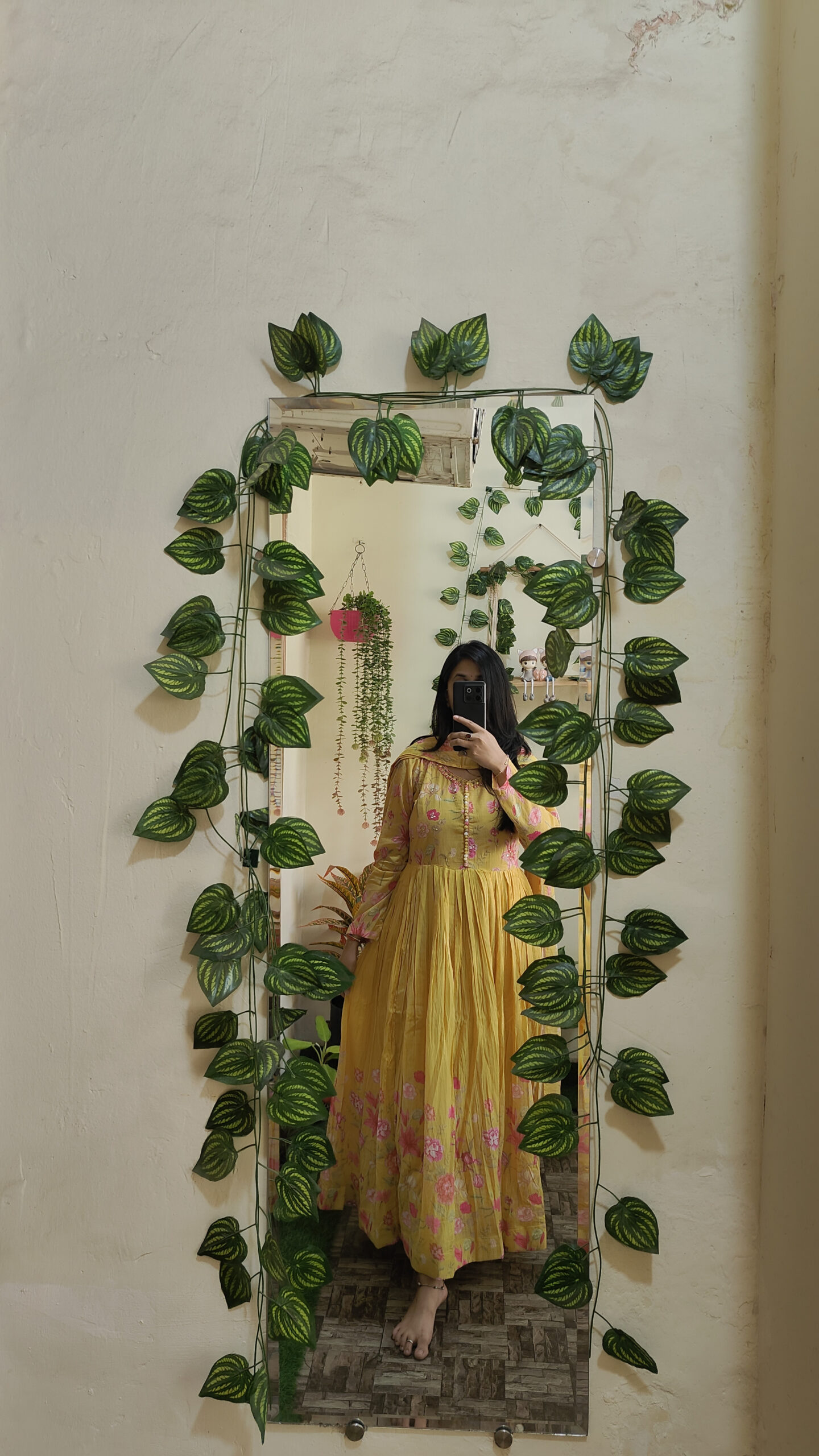 Step into elegance with Gulbano, a vibrant yellow Anarkali suit set designed for the woman who loves to blend tradition with freshness. Crafted in breathable cotton, this flowy silhouette is adorned with romantic floral prints in pink and peach tones. The neckline is delicately hand-embellished with pastel beadwork and subtle embroidery, while the flared design adds beautiful movement to every step.