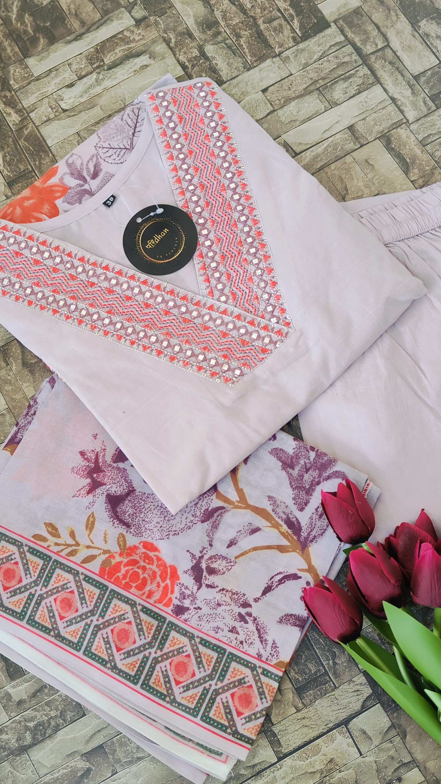 This stunning three-piece suit set exudes elegance and charm with its soft, pastel lavender hue. The set includes a beautifully embroidered kurta, a printed dupatta, and matching pants, all crafted from a lightweight and breathable fabric, perfect for warm weather.