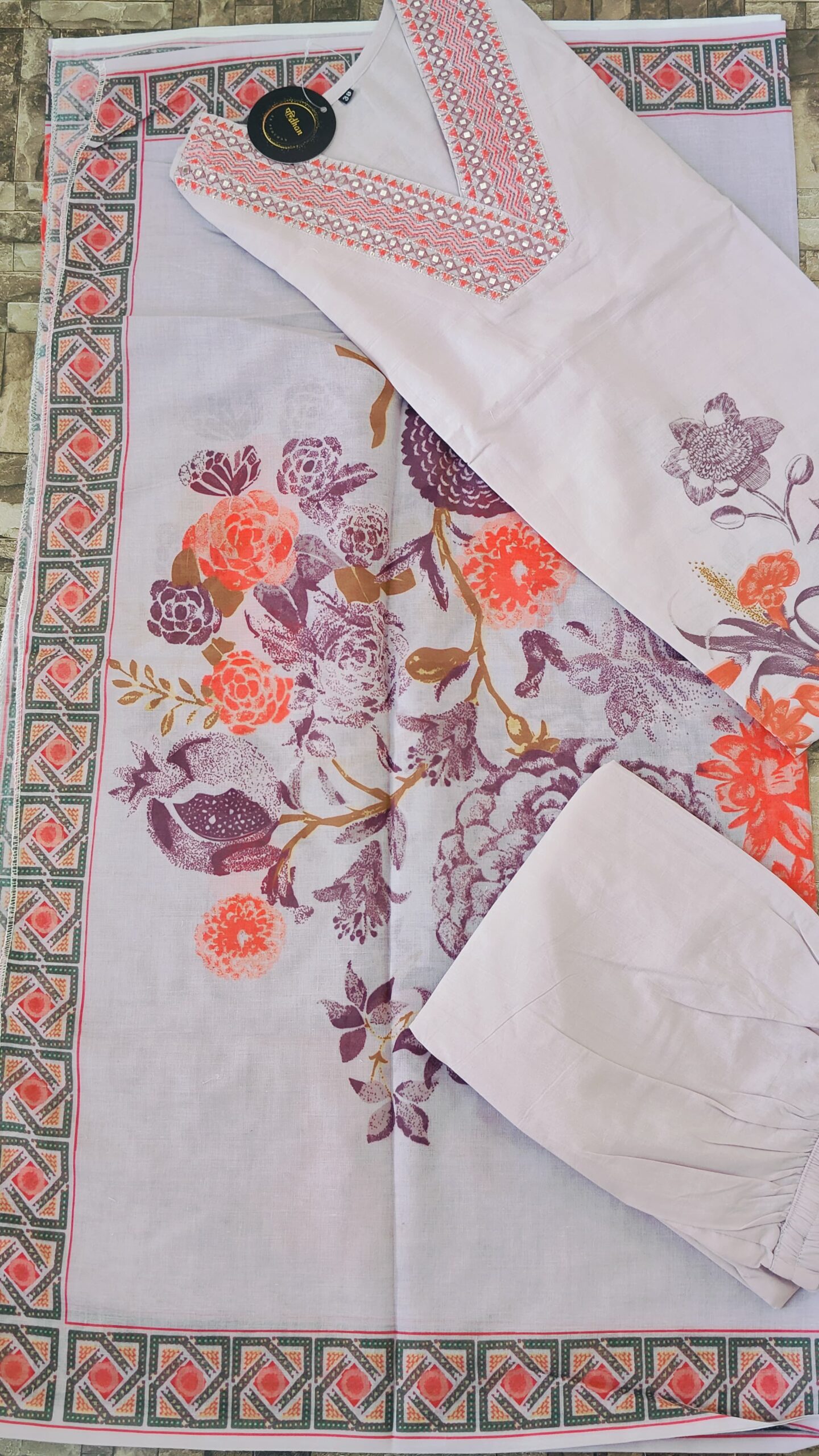 The kurta features a V-neckline, adorned with intricate embroidery in shades of pink and silver, adding a touch of sophistication and sparkle. The delicate mirror work embedded within the embroidery elevates the overall look, making it ideal for both day and evening wear.