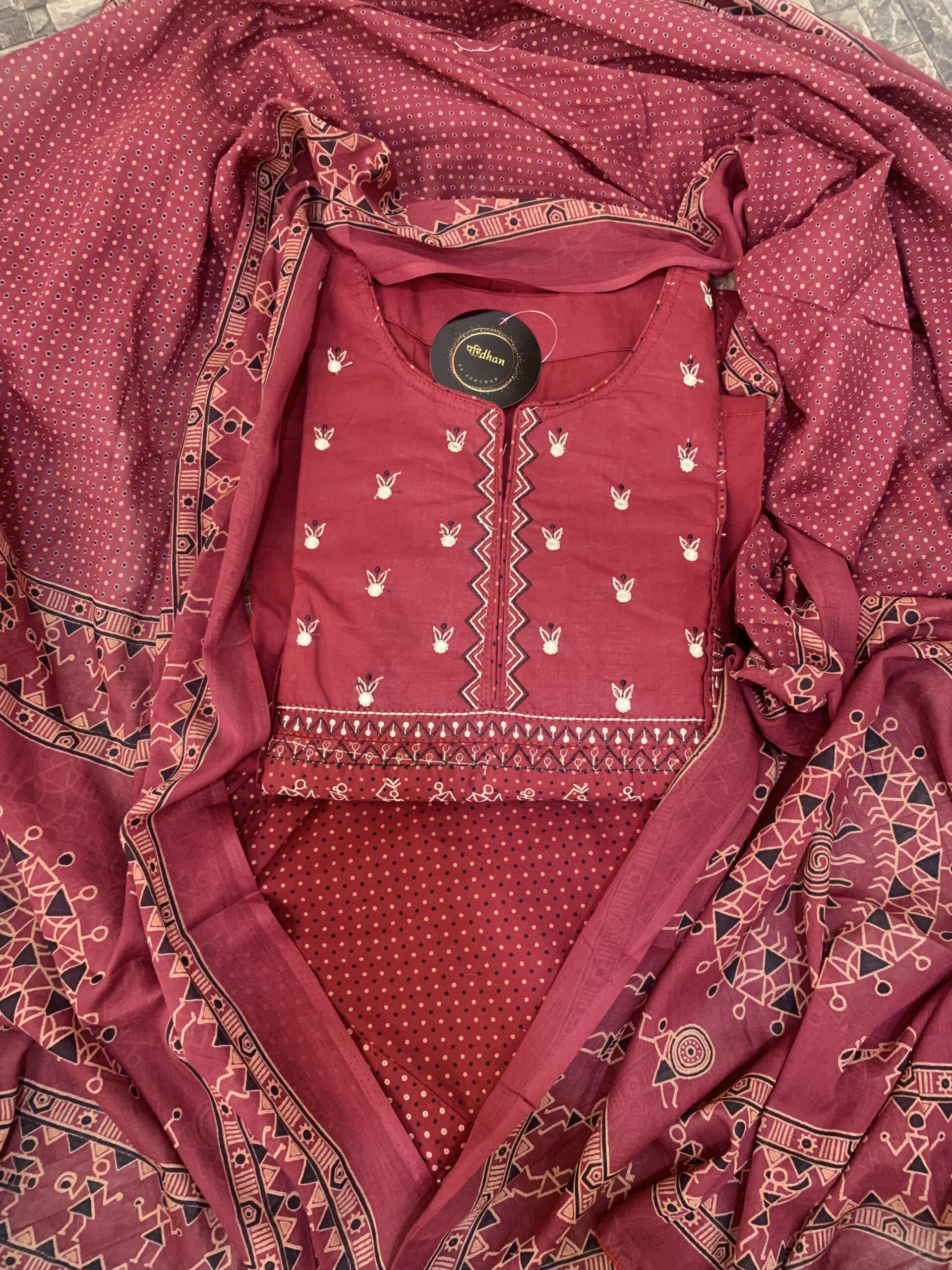 - Dupatta: Printed with Warli-inspired motifs and geometric patterns
