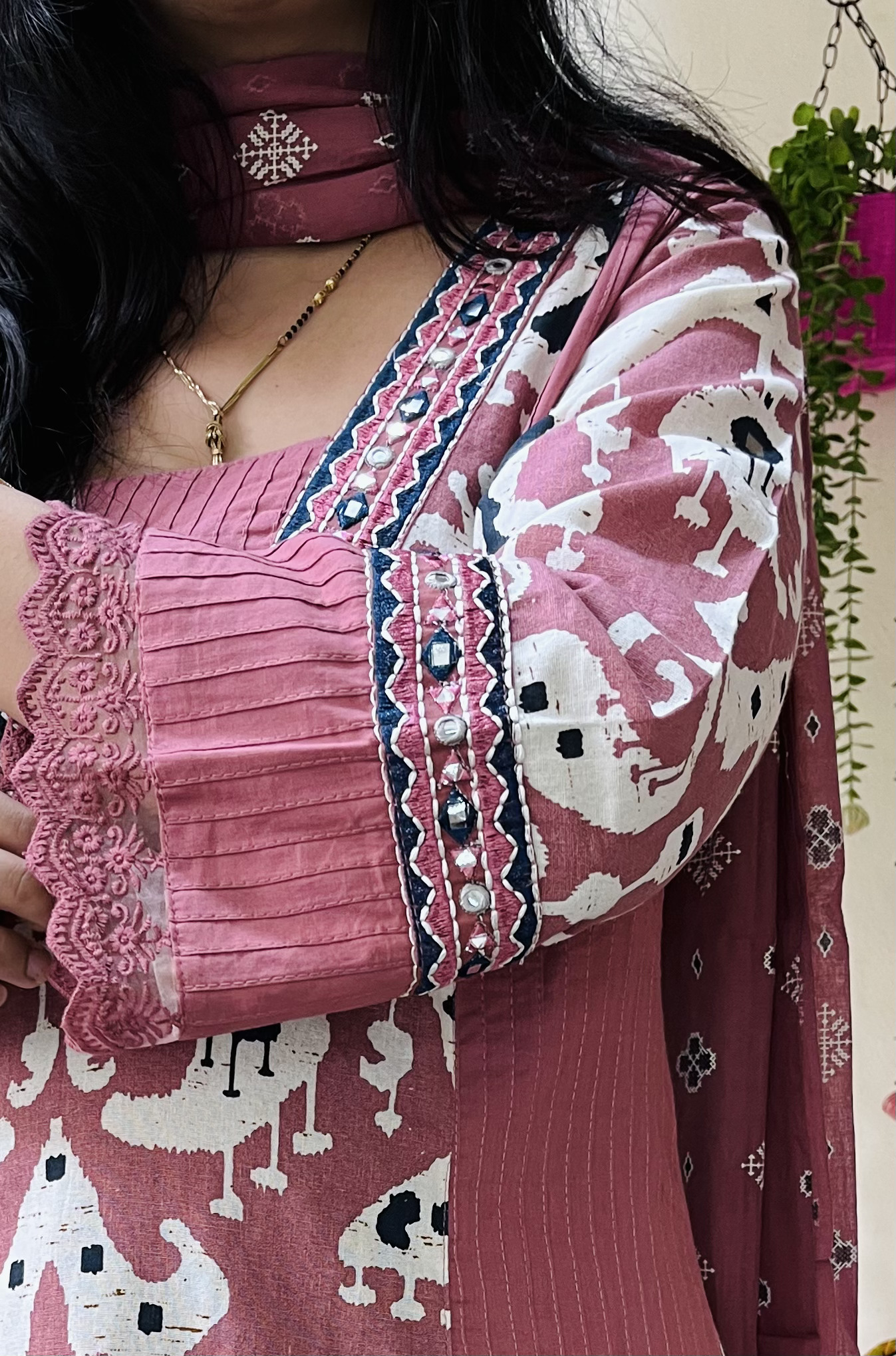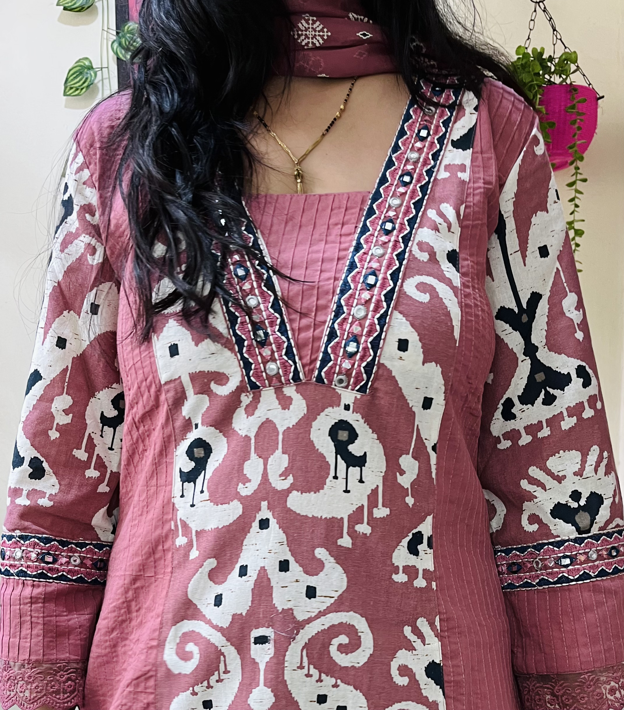 Elevate your everyday ethnic wardrobe with this stunning Ikkat kurta set in a warm rose pink shade. The kurta features an intricate Ikkat-inspired tribal print on the front panel, highlighted with elegant pintuck detailing and an embroidered neckline. The 3/4th flared sleeves with lace trims add a contemporary edge. It’s paired with matching printed pants and a coordinating dupatta that enhances the overall aesthetic.
