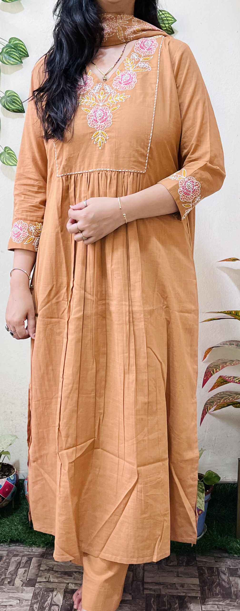 Crafted in soft, breathable cotton, this elegant kurta set comes in a deep rust brown tone that flatters all skin tones and suits both casual and festive settings. The kurta is embellished with intricate floral embroidery in pastel pink and yellow on the yoke and sleeves, adding a feminine touch. Soft gathers below the bust create a flowy silhouette, complemented by straight pants and a lightweight dupatta. An effortless pick for brunches, office days, or light celebrations.