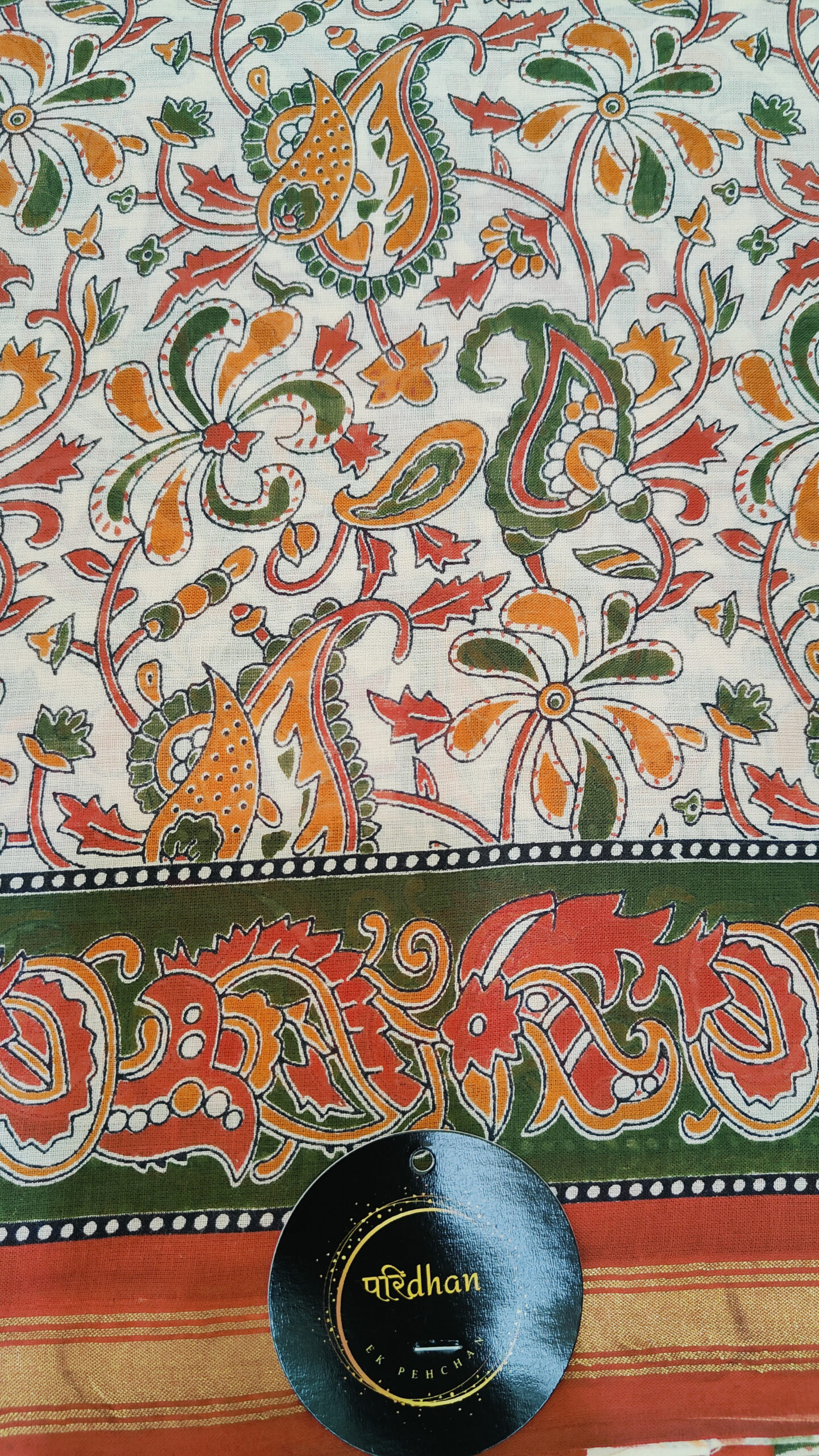 A timeless blend of comfort and grace, Varnika is a maroon Chanderi cotton saree adorned with delicate motifs and a regal golden border.
