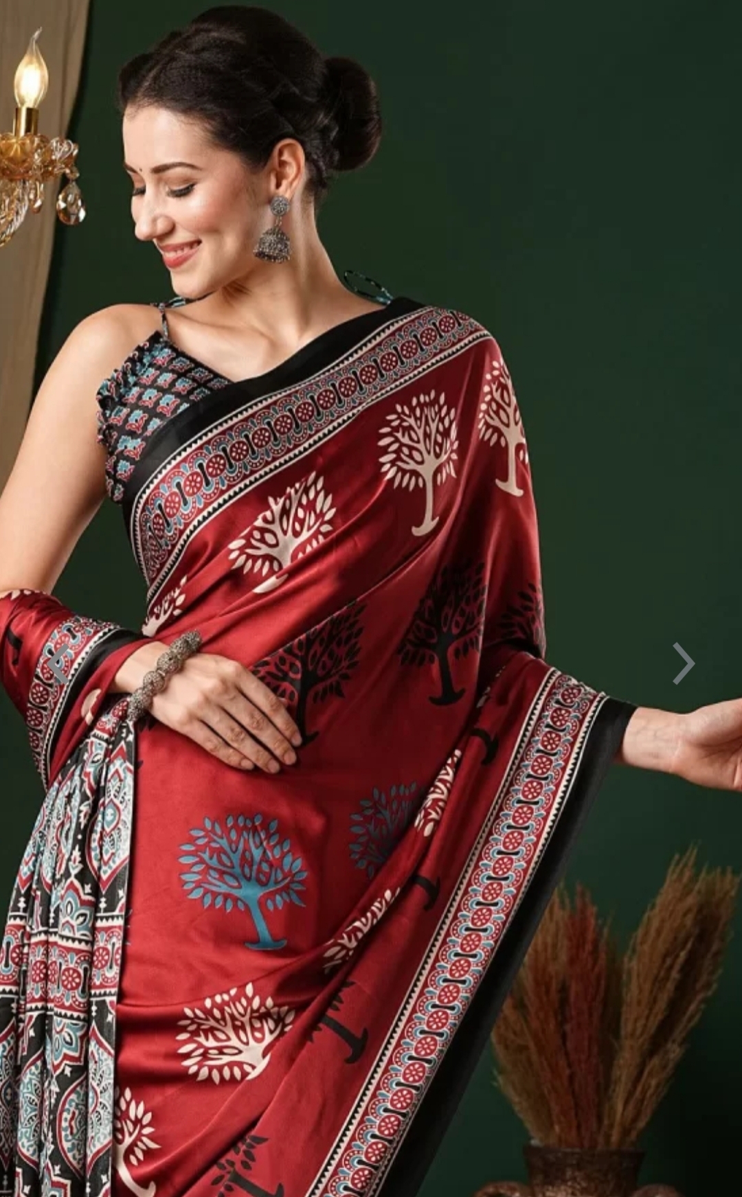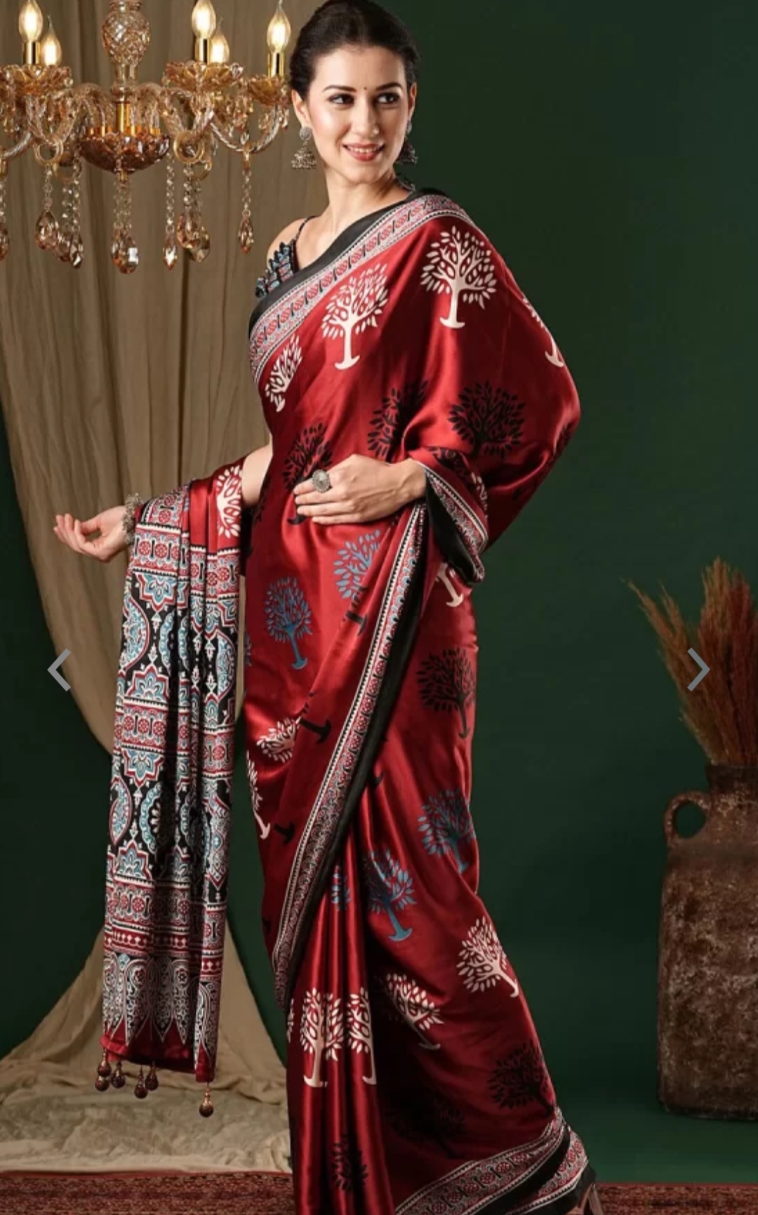 Nature-inspired sophistication in every fold — elevate your ethnic look with this enchanting maroon tree-printed saree.