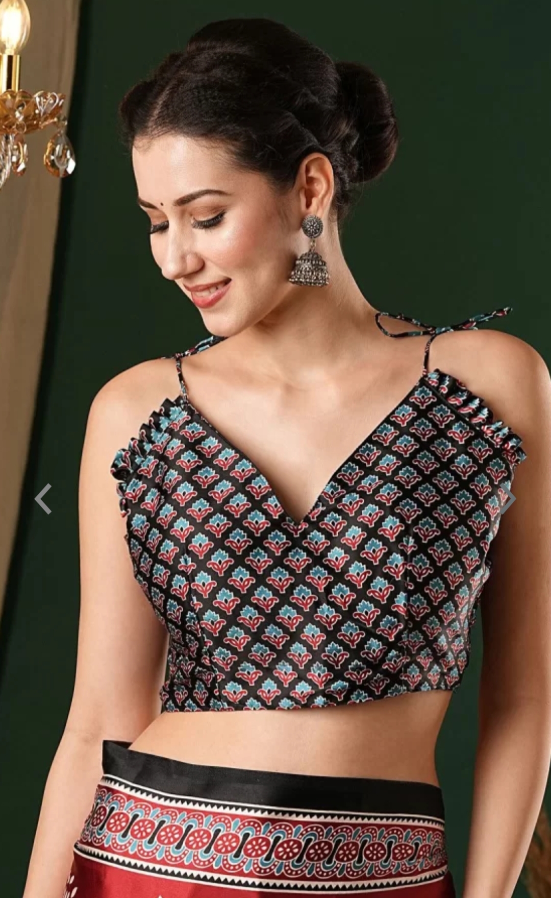 • 🔲 Contrasting printed pallu with tassels